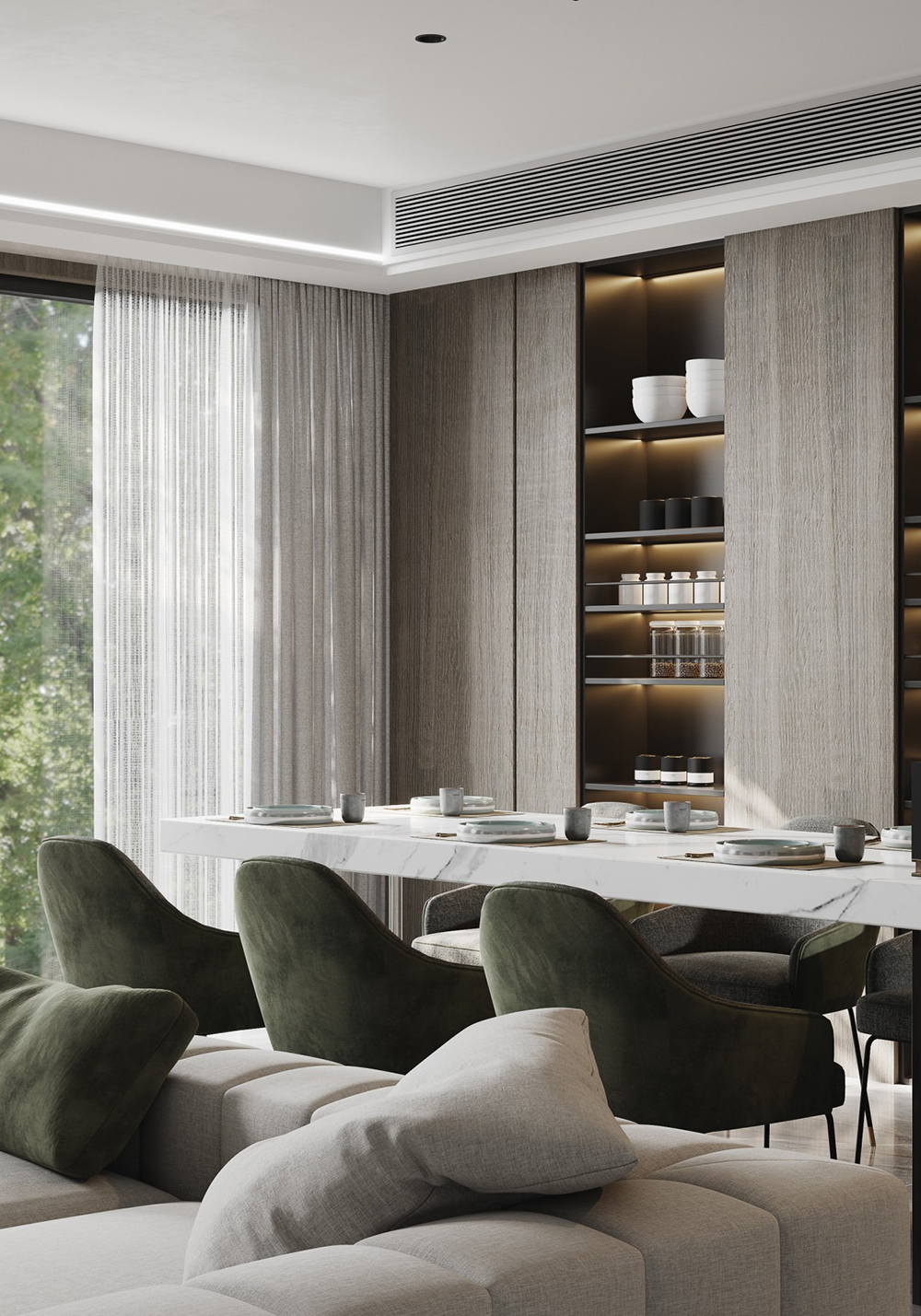 搭配點(diǎn)綴低調(diào)且高貴的綠色調(diào)裝飾豐滿提升空間,但最重要的還是軟裝細(xì)節(jié)處理、空間聯(lián)繫和材料品質(zhì)方面的考究,在合適的位置我們找到空間的統(tǒng)一平衡點(diǎn),將現(xiàn)代輕奢的其他的元素聯(lián)繫起來(lái), 形成統(tǒng)一格調(diào)的高品質(zhì)空間調(diào)性;簡(jiǎn)約中求藝術(shù),化繁為簡(jiǎn),從簡(jiǎn)單舒適中體現(xiàn)生活的精致。